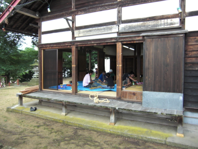 階段を登ると10人程の若者が縄や竹などの材料で何かを作って